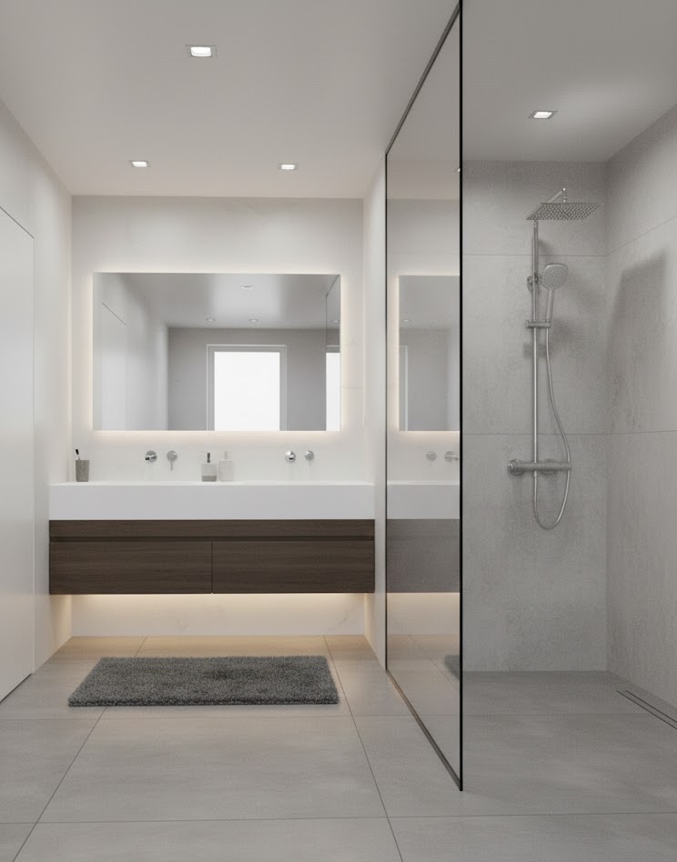 Kształty: Kwadratowe deszczownice pasują do nowoczesnych, minimalistycznych łazienek o geometrycznych formach. Okrągłe to klasyka uniwersalna dla każdego stylu. Prostokątne długie tworzą kurtynę wody idealną dla walk-in showers bez drzwi.